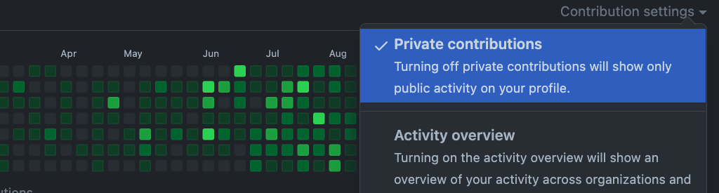 - You work on private repositories and you haven’t configured your profile to show anonymised private contributions.