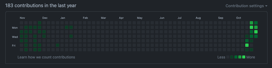 start: The day of our first “commit” in the format ofYYYY-MM-DD.stop: The day of our last “commit” in the format ofYYYY-MM-DD.max: We don’t want a single commit per day. Otherwise, the graph will be all one colour and not at all random enough to look legitimate. So, to account for this, we randomly create between1and20commits per day.